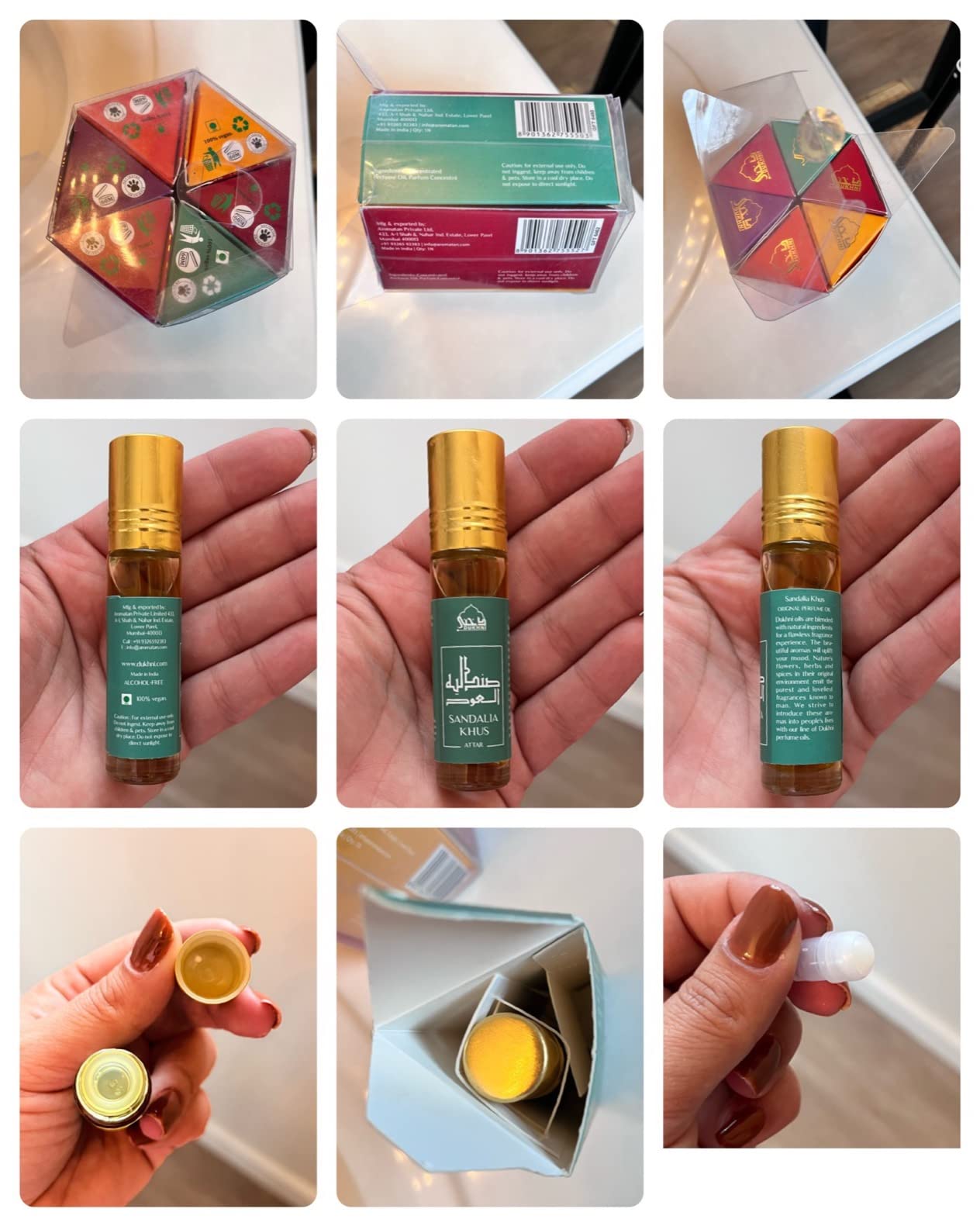 I received this Dukhni Attar Oil Set.A wonderful smell of perfume oils in the package.- Smell of Rose and Musk- Smell of Jasmine and Saffron- Smell of Leathery, Woody, and Earthy- Smell of Smoky, Sweet, and Woody- Smell of Spicy and warm aroma- Smell of Rose, Ylang-ylang, and White muskI never use it directly on my clothes because it can stains so I use it on my hands, neck, and back of my ears. These all smell amazing. Sometimes I use a couple of them for aromatherapy They offer excellent value for money. Overall, I like it.