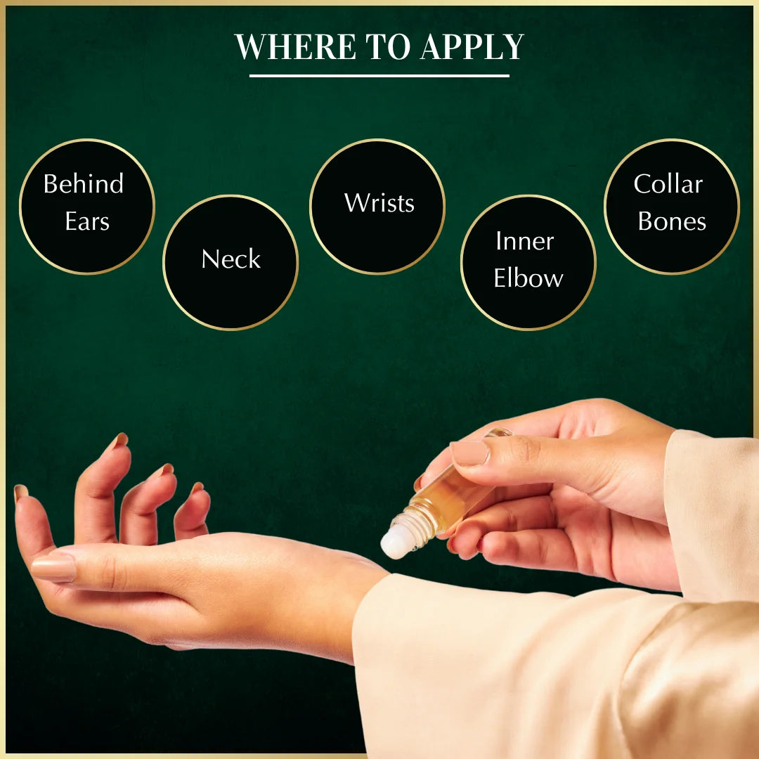 Use the roll on to apply a tiny drop on pulse points - wrists, behind the ears, sides of the neck, and inner elbows. Since it’s a concentrated perfume oil, a little goes a long way. Fragrance lasts for over 14 hours.