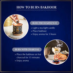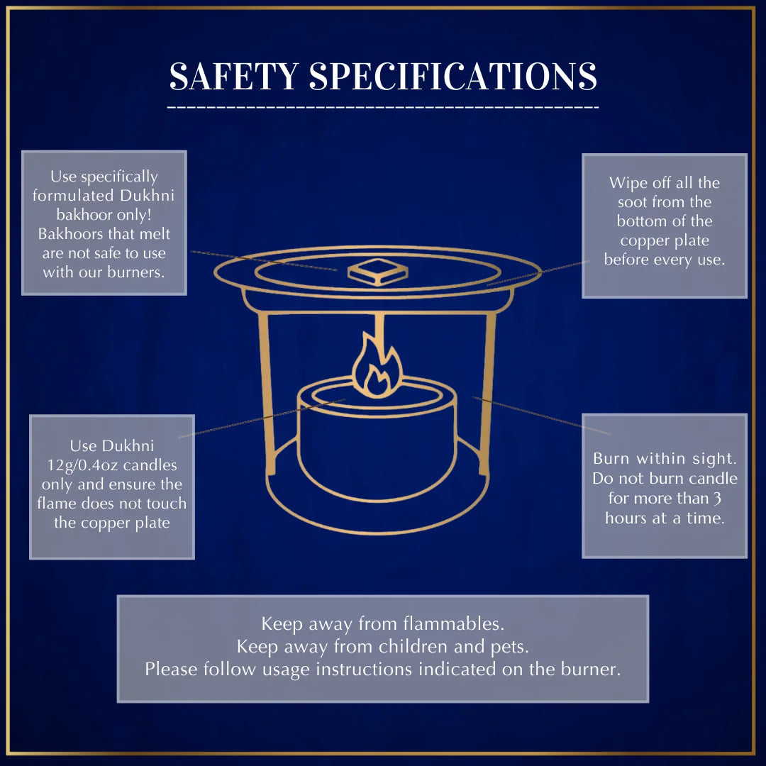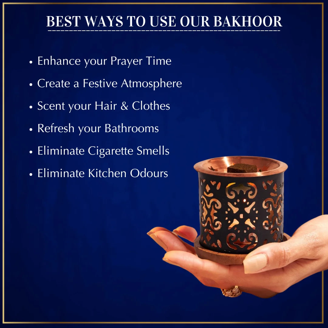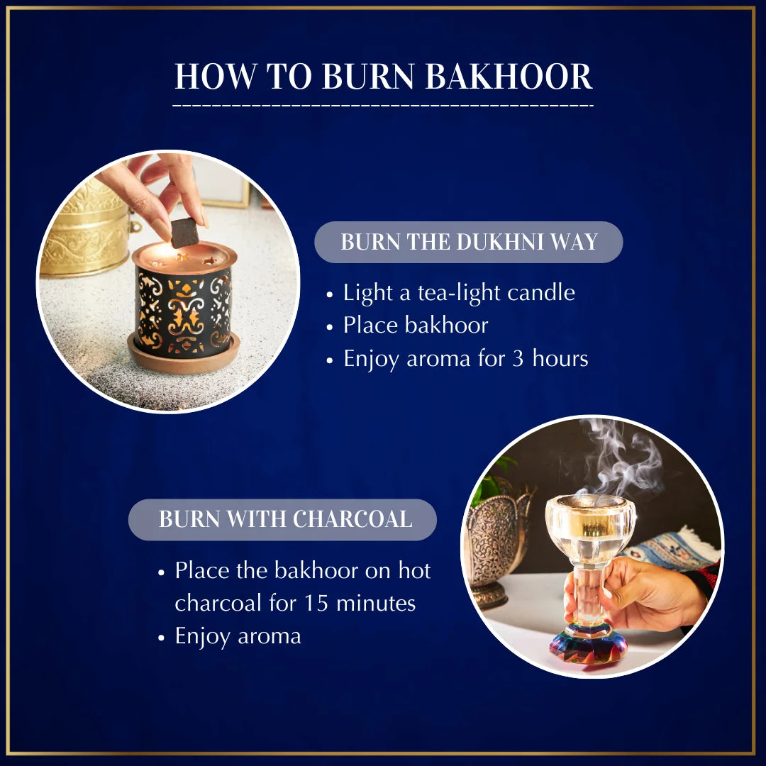 Bakhoor Burner: Place the metal burner on the wooden coaster and the copper plate above. Place a piece of bakhoor on the plate and light the tealight candle beneath. Use tealights with a 3.5-hour burn time. The scent diffuses steadily without smoke and covers up to 400 sq. ft. Alternatively, burn bakhoor traditionally on charcoal.