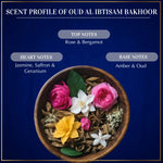 Oud Al Ibtisam Bakhoor: A distinctive floral scent combining rose, bergamot, and jasmine, enhanced with warm woody base notes of amber and oud. Uplifting and energising, perfect for prayer time, meditation, or relaxing at home.