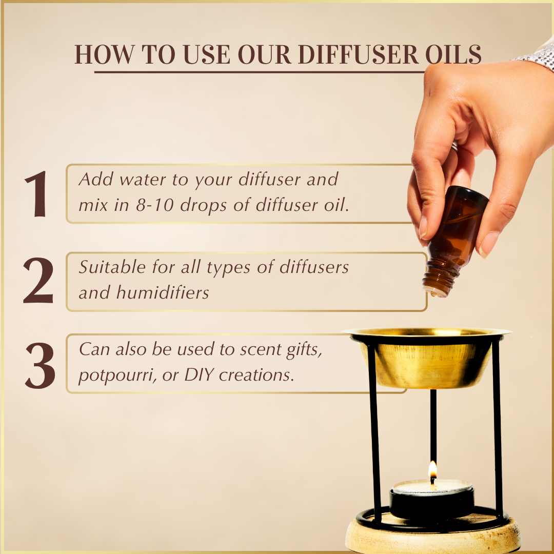Just add 8-10 drops of the diffuser oil the burner and light the tea light candle, and enjoy hours of soothing fragrance. Add more diffuser oil for a stronger scent.