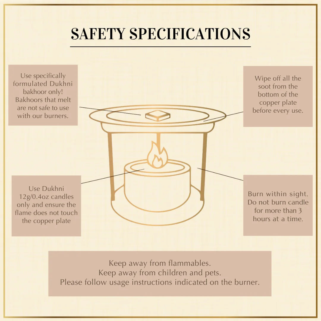 Burning: Do not burn the piece of bakhoor directly. Always use a Dukhni burner, electric burner or a charcoal burner.