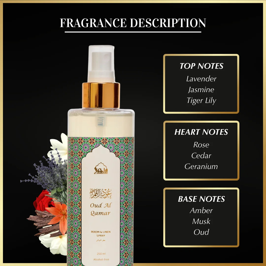Refresh your space in just 5 minutes with our non-alcoholic oud room and linen spray. This 250ml Mist Spray is perfect for fabrics, furniture, prayer mats, and more—bringing a subtle, luxurious fragrance to your home. Ideal as a room, linen, or car spray, it instantly elevates your surroundings with a gentle and safe aroma.