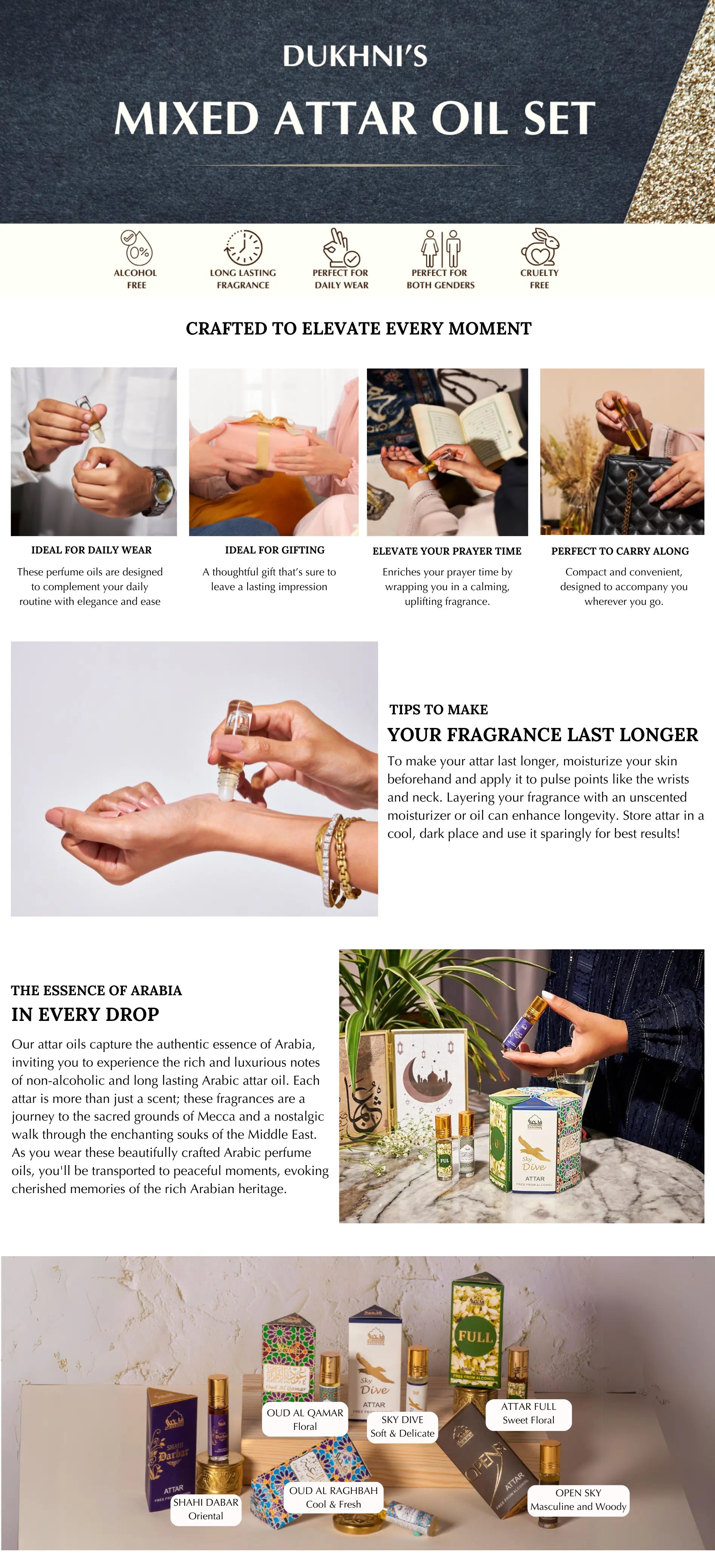 The mixed attar set contains 6 assorted scents that are luxurious and long lasting. This makes them ideal for moments — like a 5 year anniversary present, moms day gifts, first mothers day gift, or even Christmas gifts for fathers. It's like giving someone a scent story.