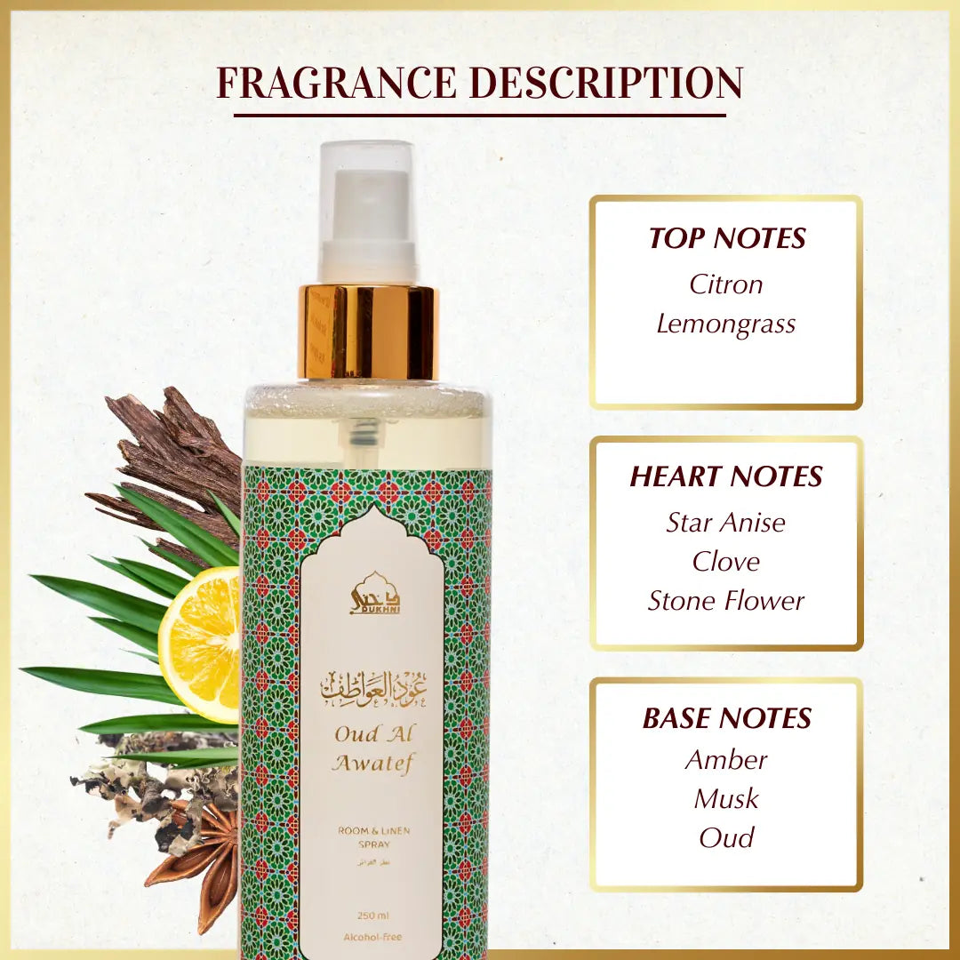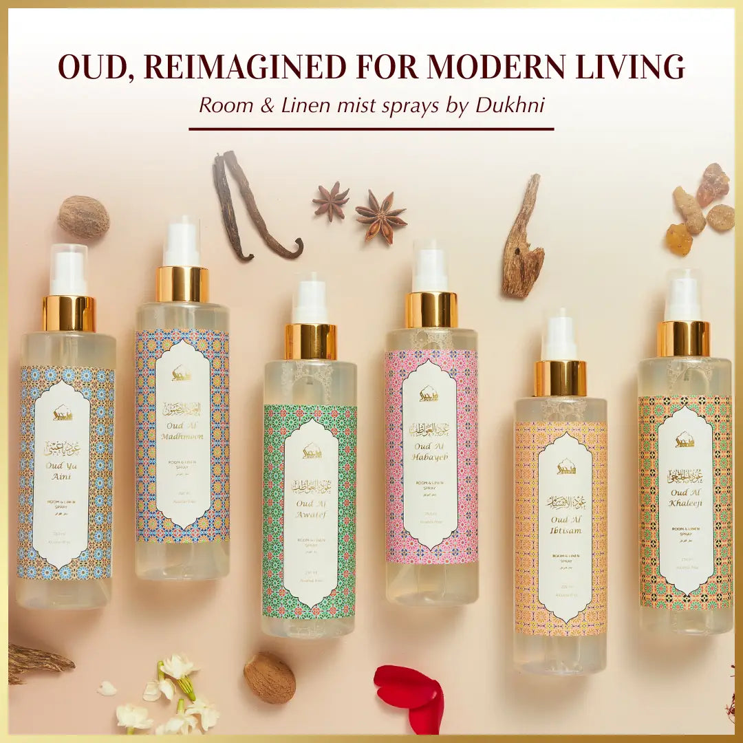 Refresh your space in just 5 minutes with our non-alcoholic oud room and linen spray. This 250ml Mist Spray delivers a clean, invigorating fragrance to fabrics, furniture, prayer mats, and more. Gentle and versatile, it works perfectly as a room, linen, or car spray—bringing effortless freshness to your everyday spaces.