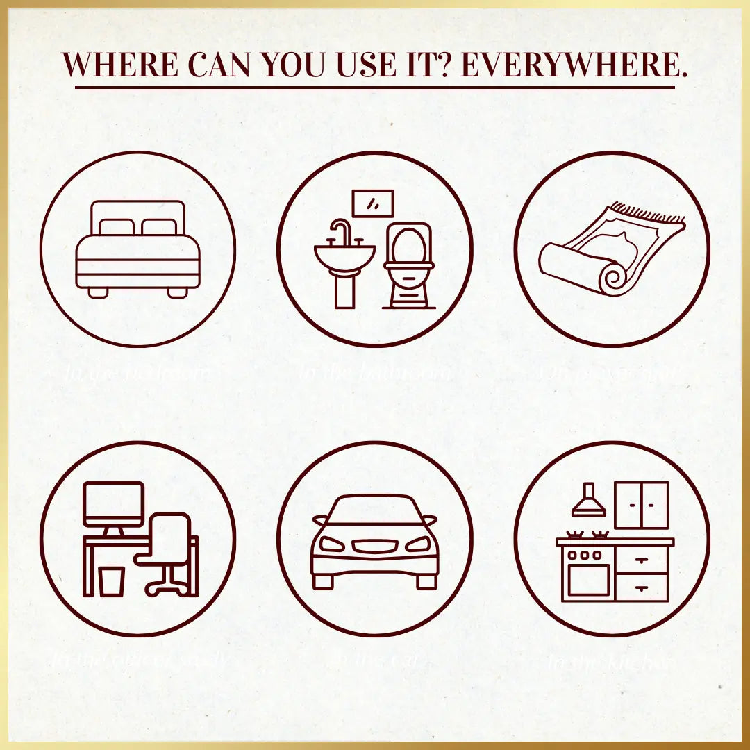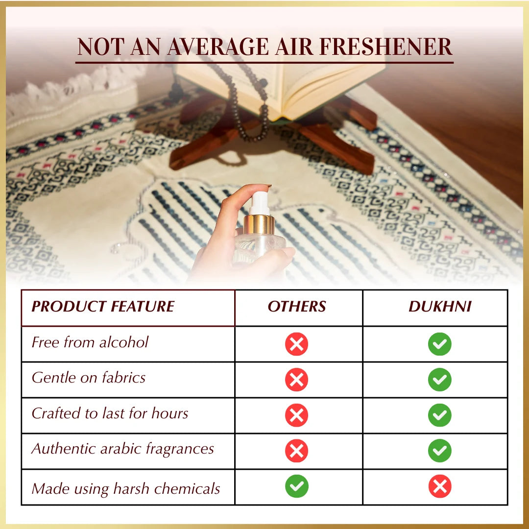Refresh every space with the soothing scents of Arabia. After cooking, just a quick spray replaces lingering food smells with a clean, warm fragrance. In the car, it instantly freshens the air and adds a touch of luxury to your commute. During prayer, the calming aroma creates a peaceful atmosphere that helps you feel centered and connected. Even in your workspace, a light mist sets an uplifting mood, helping you stay focused and grounded throughout the day.