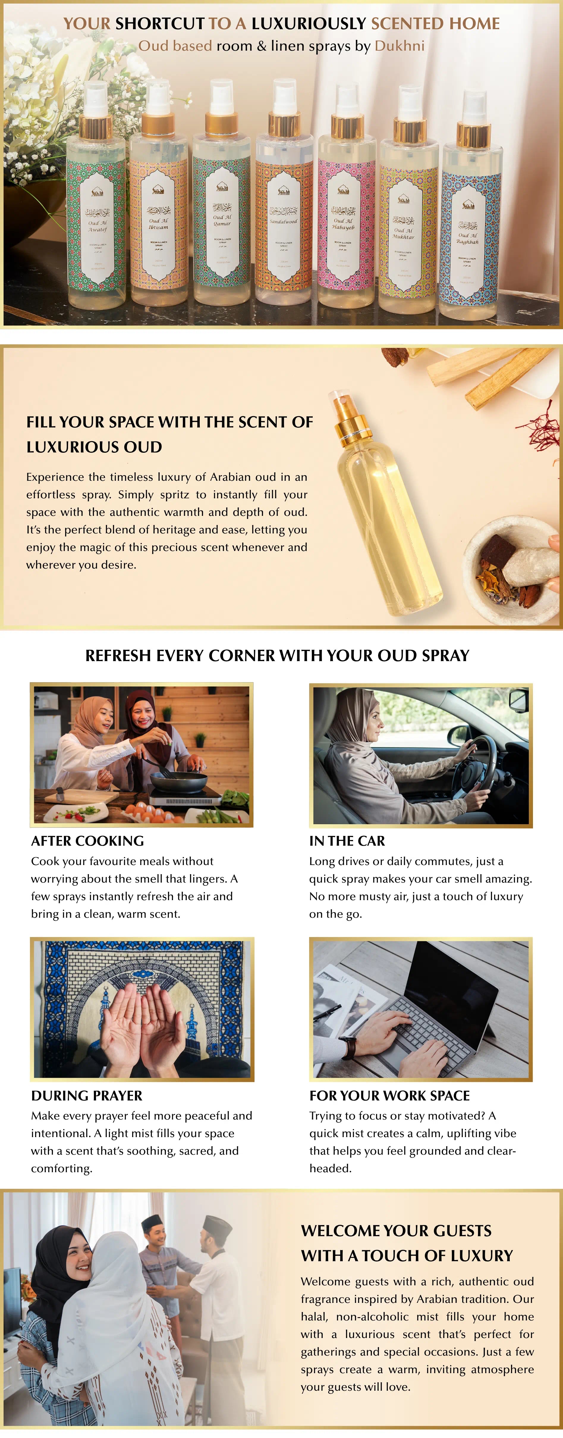 Transform your space Dukhni mists are ideal for refreshing fabrics, prayer mats, furniture, and more. Versatile as air fresheners, car sprays, or for revitalizing your kitchen and bathroom, they're perfect for any moment, be it pre-prayer, pre-guests, or post-cleaning.