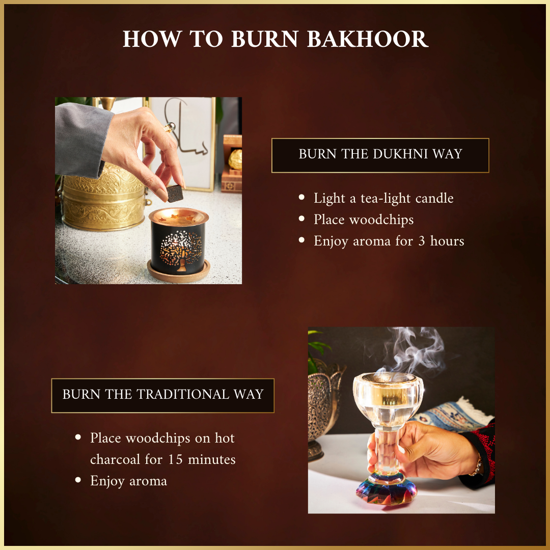Place a bakhoor piece on a heated charcoal disc, electric burner, or Dukhni candle burner. Allow the aroma to gently diffuse, filling your space with luxurious fragrance. Use daily or for special occasions to create a serene, welcoming environment.